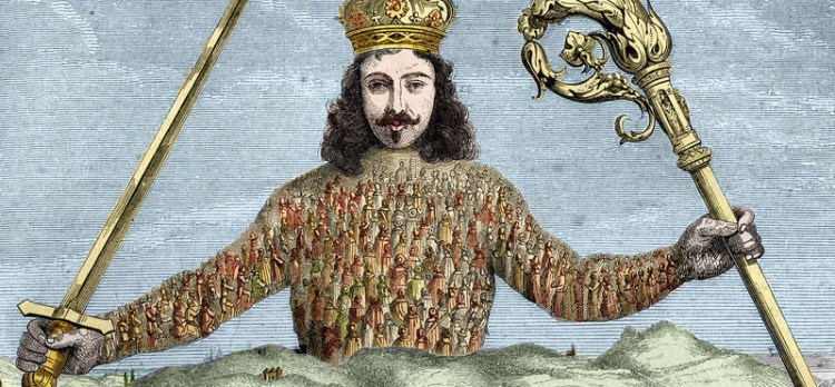 A colourised version of the cover of Leviathan by Thomas Hobbes.