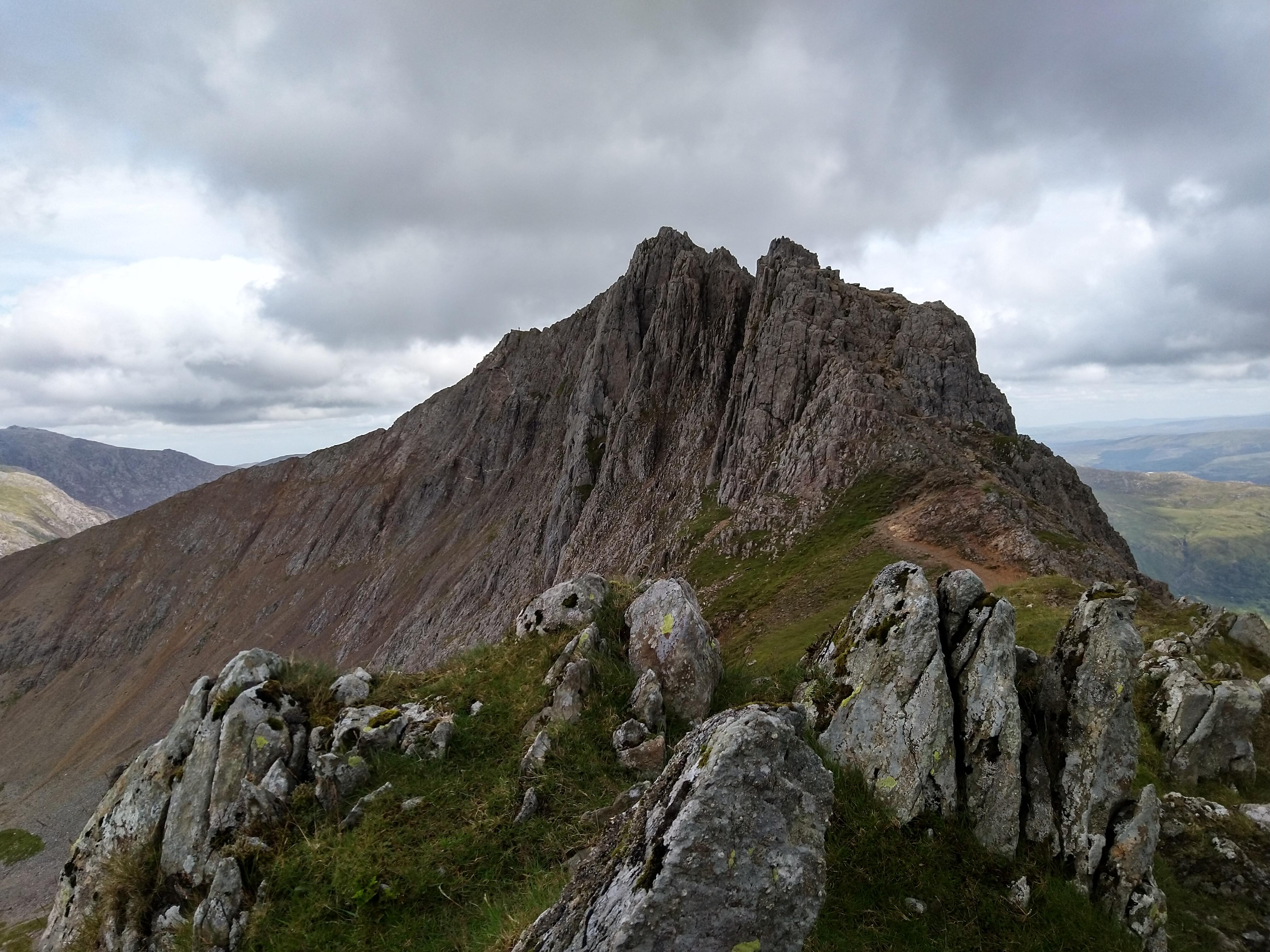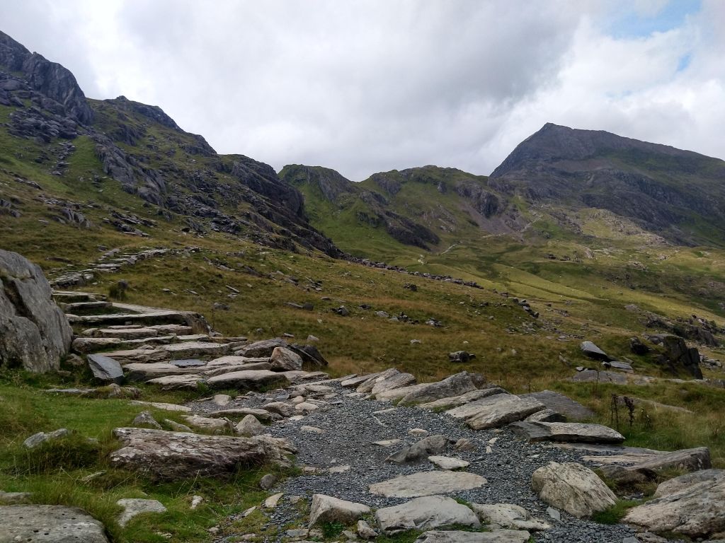 The path to Crib Goch. The pointed arete of Crib Goch looms over this approach, visible on the right hand side.