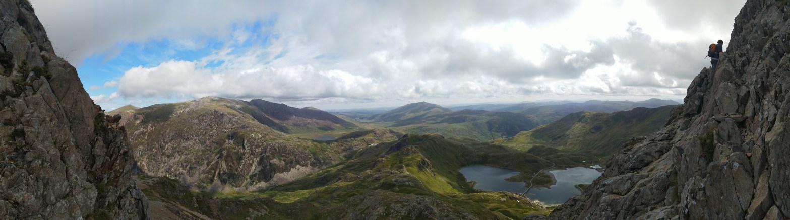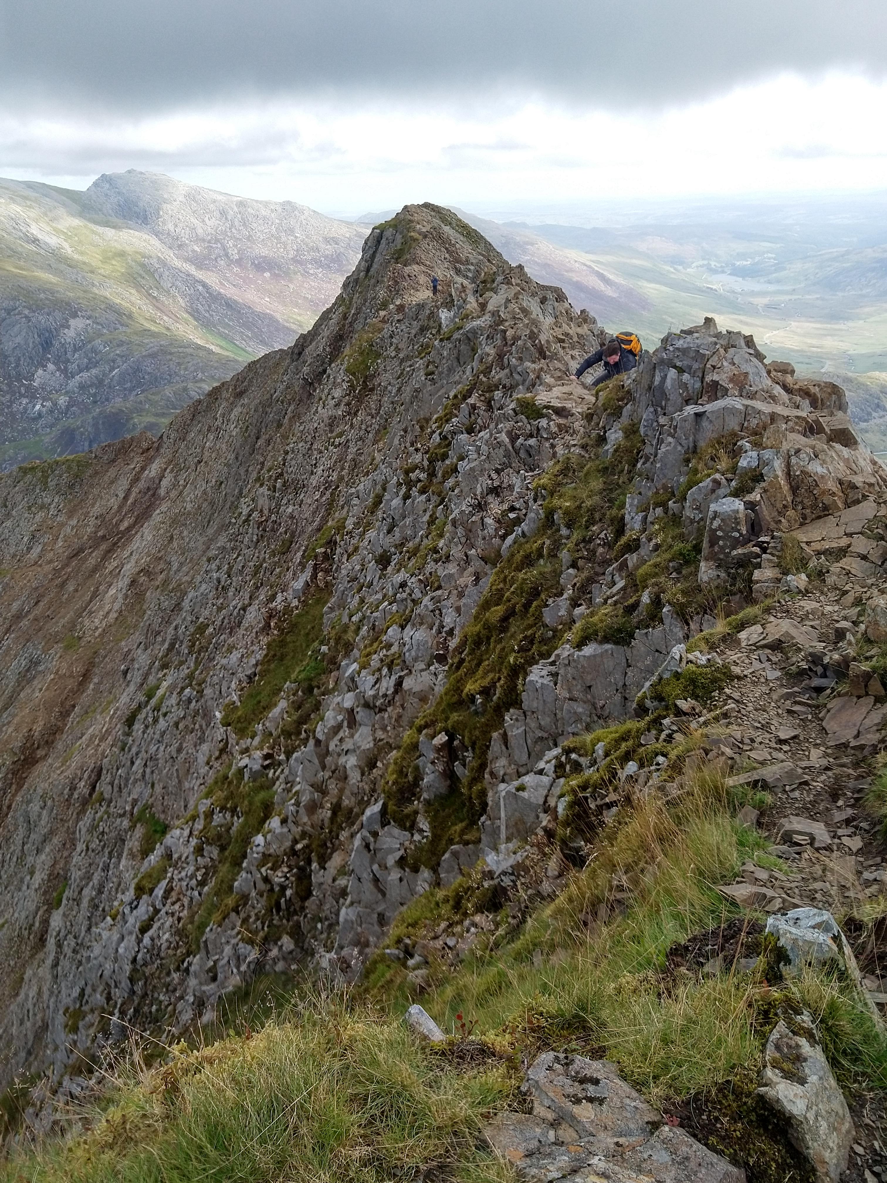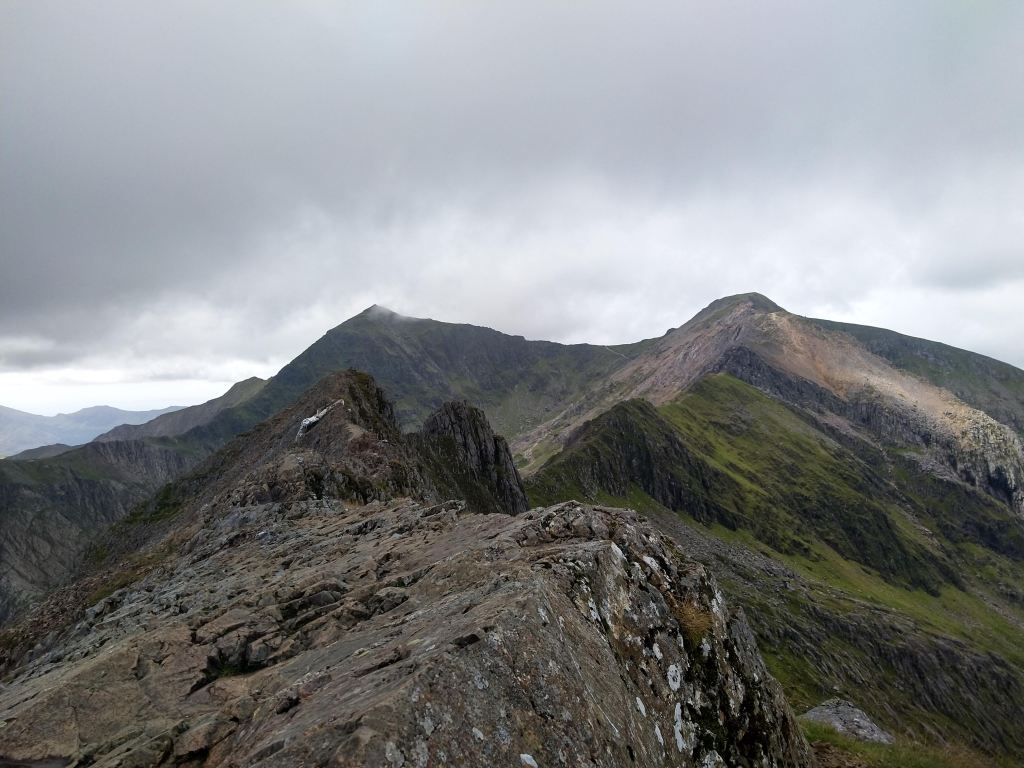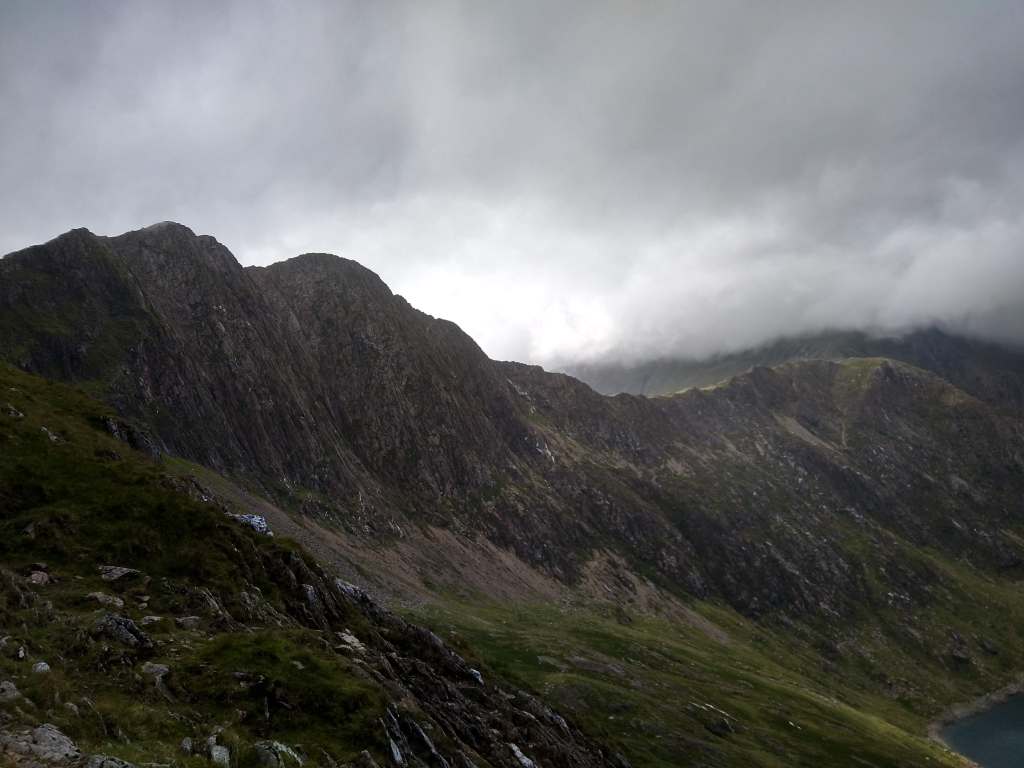 As you clamber up the first cliff face to the beginning of the ridge, be sure to turn around and take in the views of the valleys below before they’re swallowed by clouds. The valley floor sweeps away below you, pulsing as the shifting light makes the landscape seem alive, the smattering of lakes twinkling back from their homes, squeezed in between the raised ridges of the Welsh landscape like a child asleep between sofa cushions. On a clear day this view seems to stretch all the way to England, on a bad day you should probably turn around at this point.