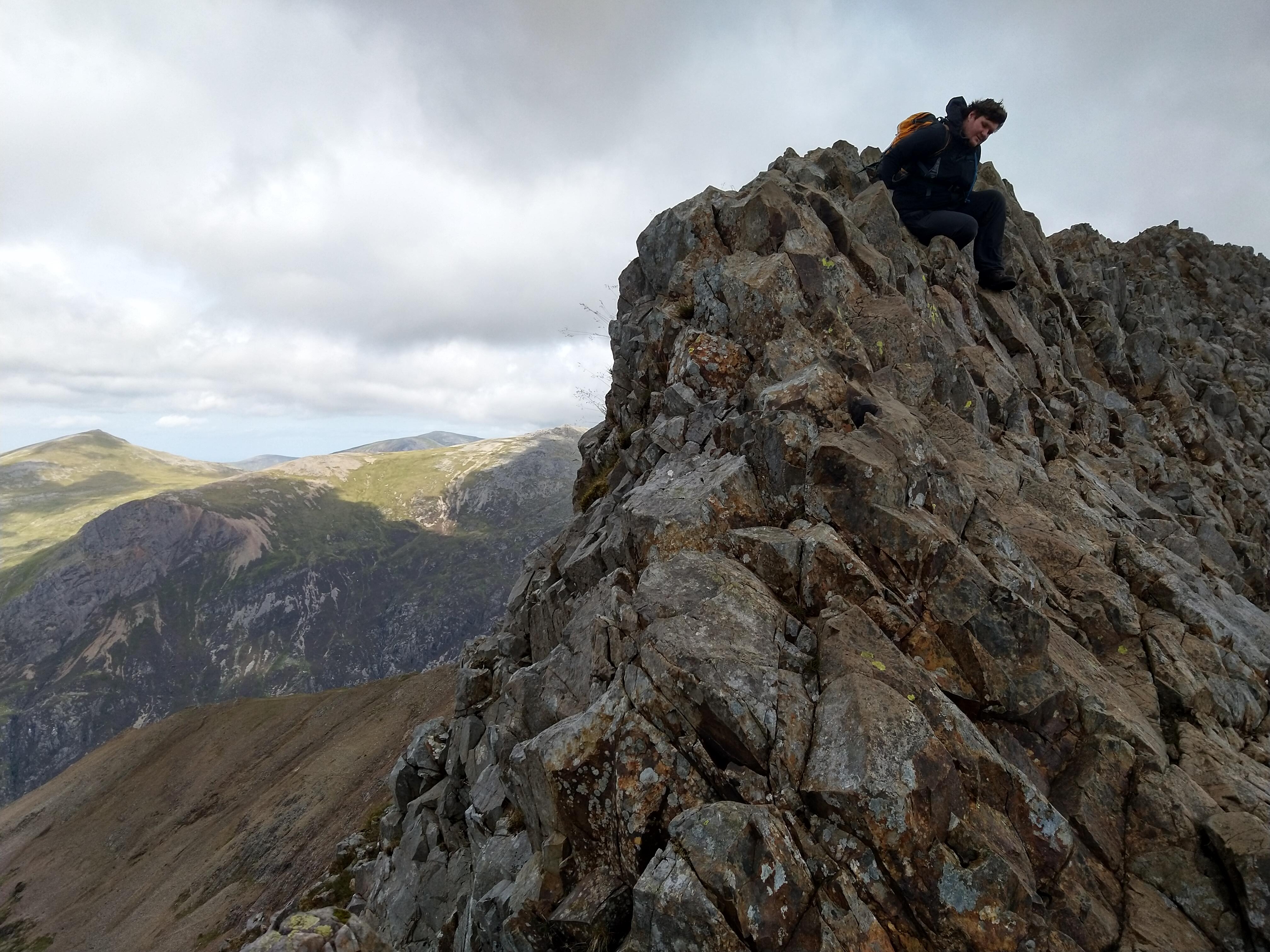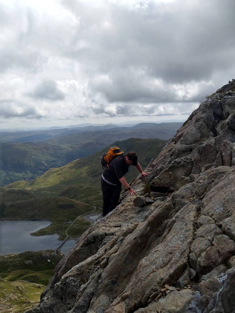 Attempting to find a route up to Crib Goch can be challenging enough. Here a friend traverses a ledge above the valley floor.