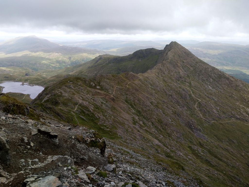 Snowdon, to the left of center points upwards with it’s easily discernibly shape. Here viewed from Crib Goch, the route we followed is directly along the ridge that goes from center-left to right and back around to Snowdon, before dropping down the mountains left shoulder to the final ridge of the horseshoe.