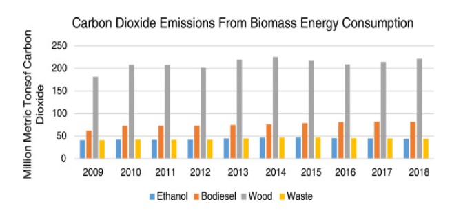 Emissions of CO2 from US biomass energy consumption compared to other renewable energy sources.